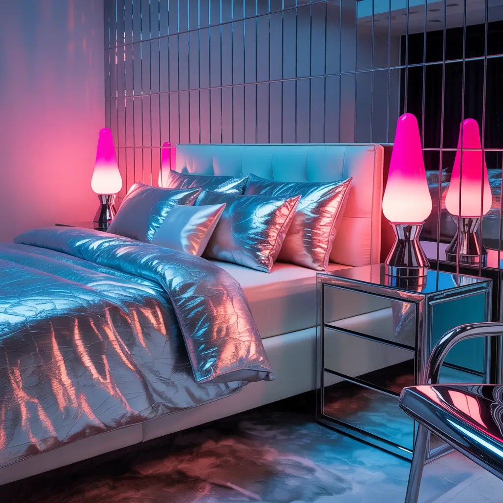 - Metallic and holographic furniture (to reflect the glow)