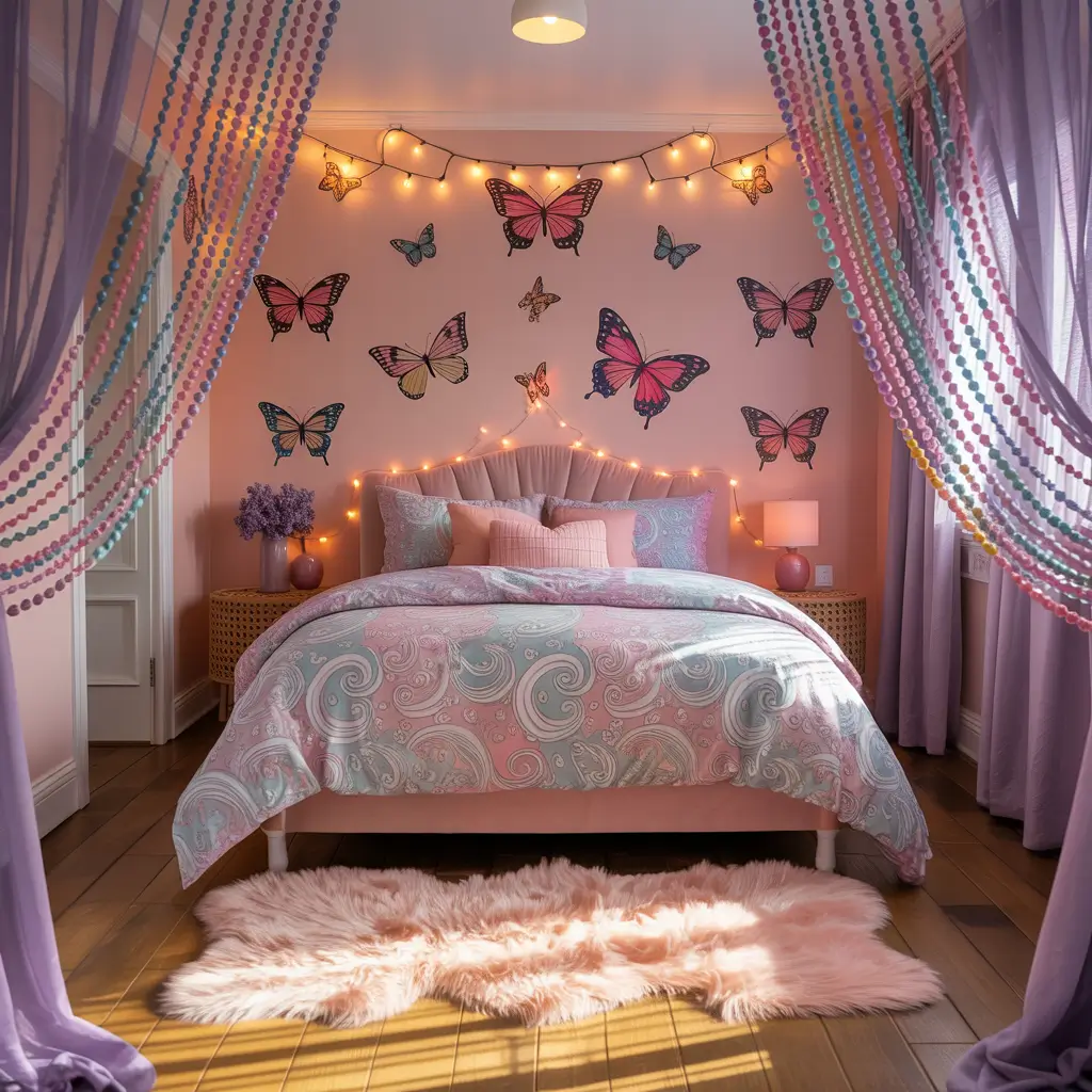 - Sheer curtains with butterfly prints (dreamy effect)