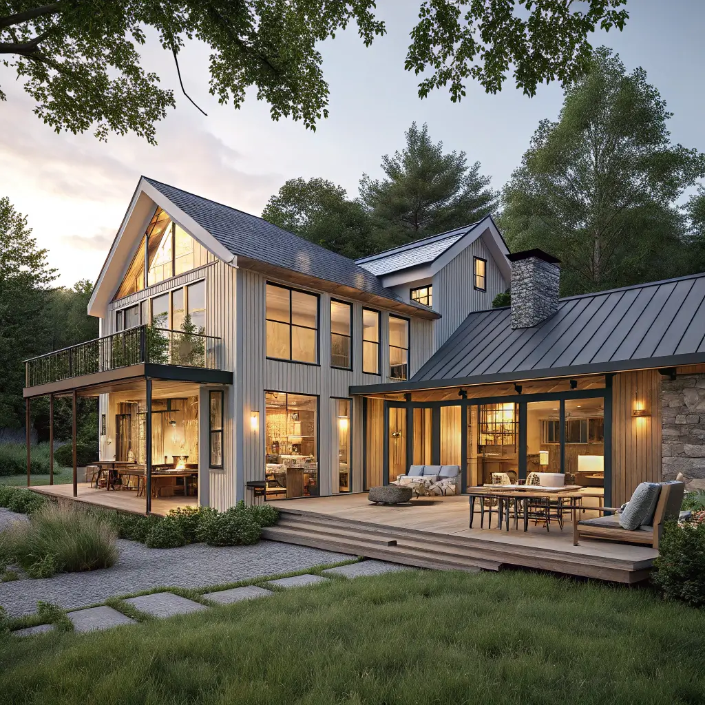 Modern farmhouse combines rustic warmth with clean contemporary lines. White painted exteriors, black window frames, metal roofing accents, and board-and-batten siding create the characteristic aesthetic. Inside, shiplap walls, exposed beams, and industrial-inspired fixtures continue the theme.