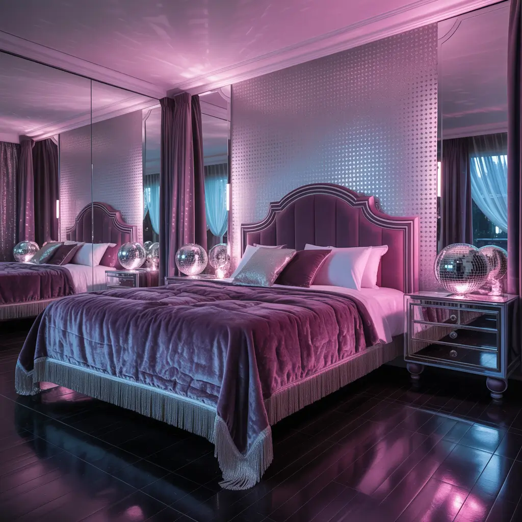 Ready to turn up the glamour? The disco glam mirror bedroom takes everything fabulous about Studio 54 and brings it home. We’re talking mirrored furniture, metallic accents, and enough sparkle to make a disco ball jealous.