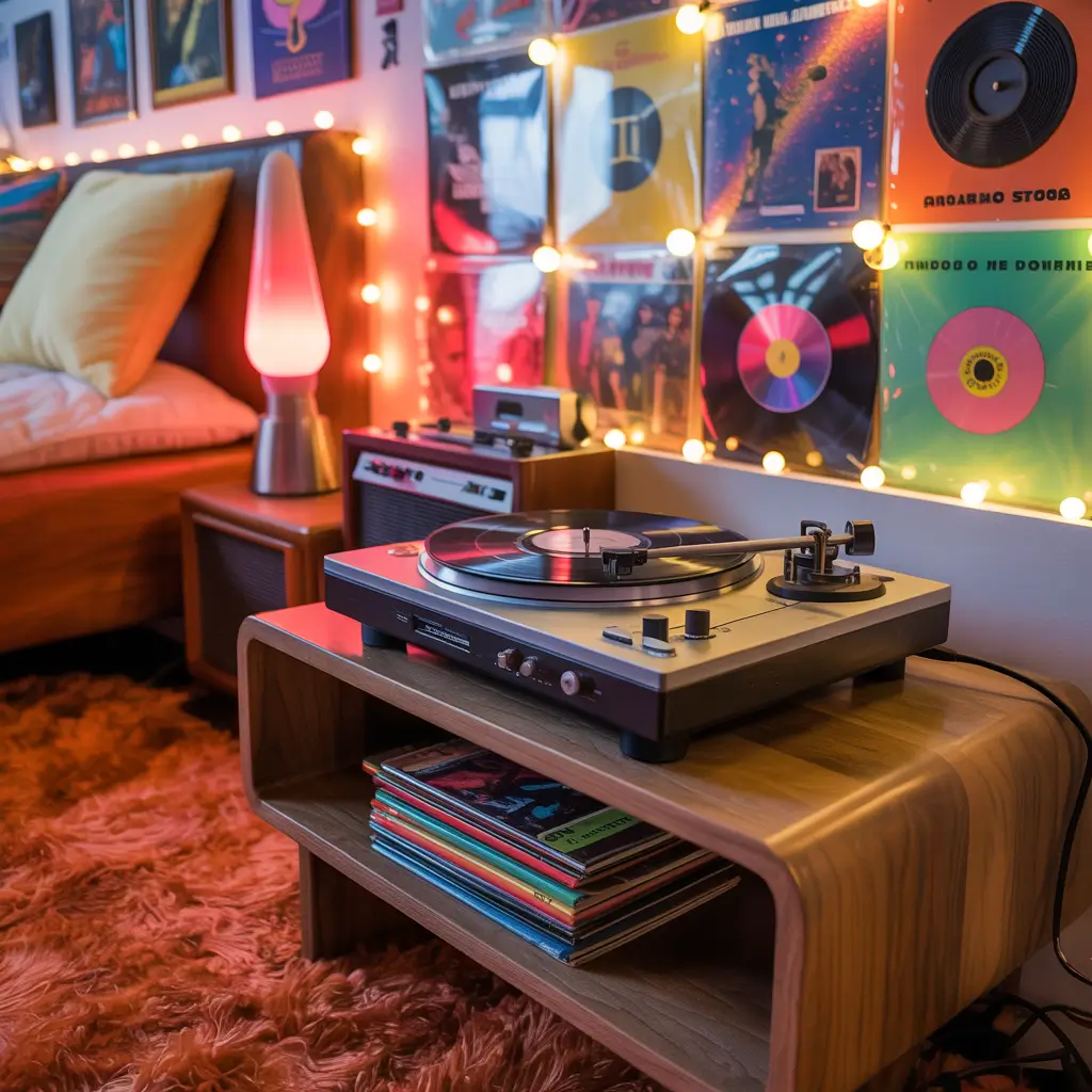 Got a vinyl collection gathering dust? Time to make it the star of your bedroom with a retro record wall display. This isn’t just decoration – it’s a conversation piece that shows off your musical taste while nailing that 70s aesthetic.
