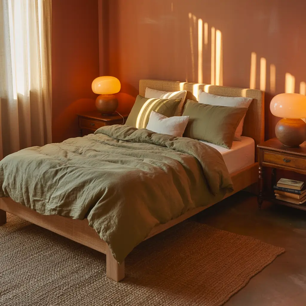 Paint walls in a warm mustard shade and add olive green through textiles and plants. I used mustard curtains with olive bedding and the combination feels both bold and sophisticated.