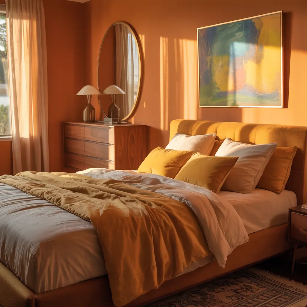 Sunset orange captures that perfect 70s warmth without feeling dated. This color creates instant coziness while nodding to retro style.