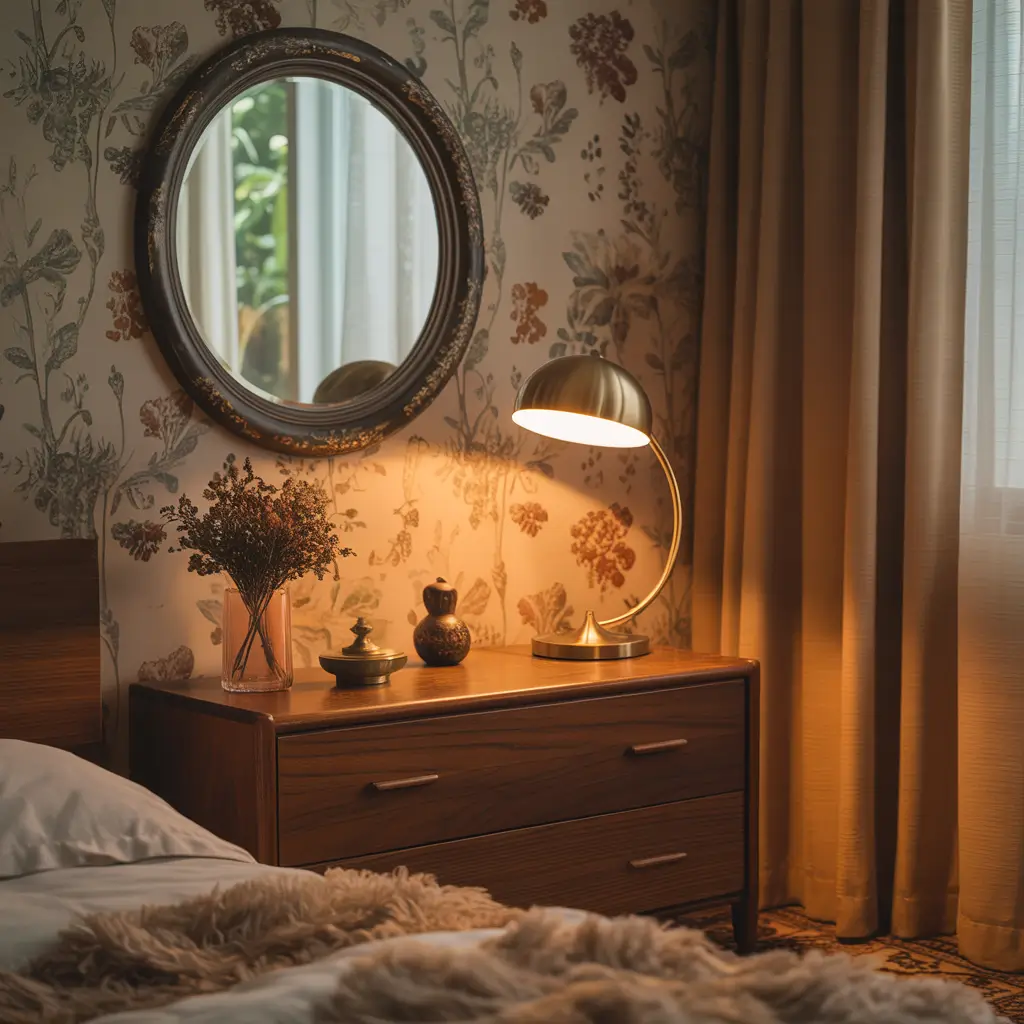 Look for mushroom lamps, globe lights, or sunburst mirrors. My brass floor lamp and matching mirror create perfect 70s symmetry while remaining functional.