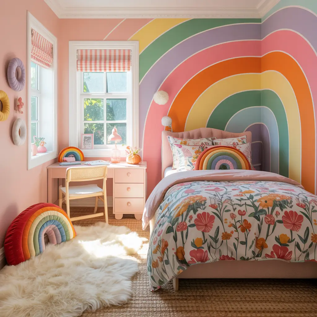 I helped my niece create a pastel rainbow room that’s honestly Instagram-worthy. We painted one accent wall with soft rainbow stripes—pale pink, peach, butter yellow, mint, sky blue, and lavender. The other walls stayed white, furniture stayed neutral, and the rainbow became art rather than assault on the eyes.