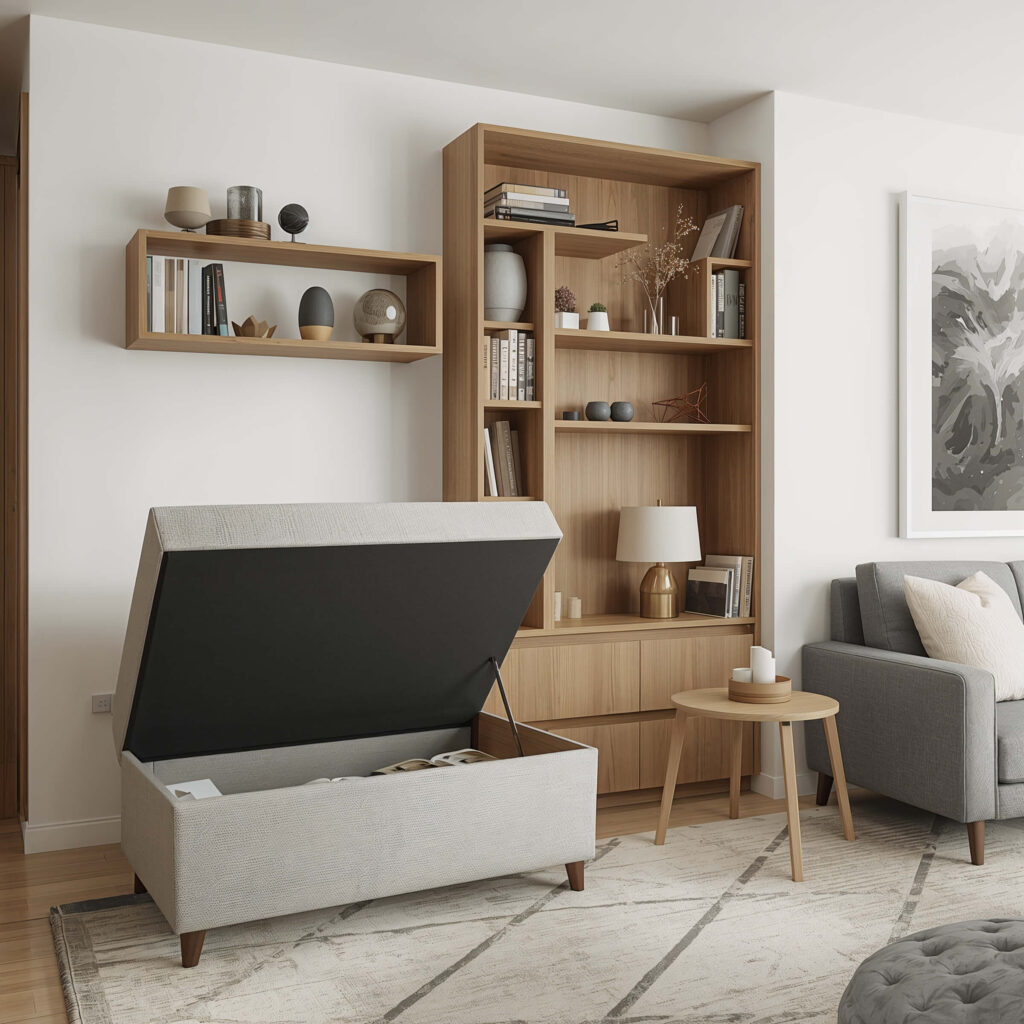 - Hidden storage furniture – beds with drawers, hollow ottomans