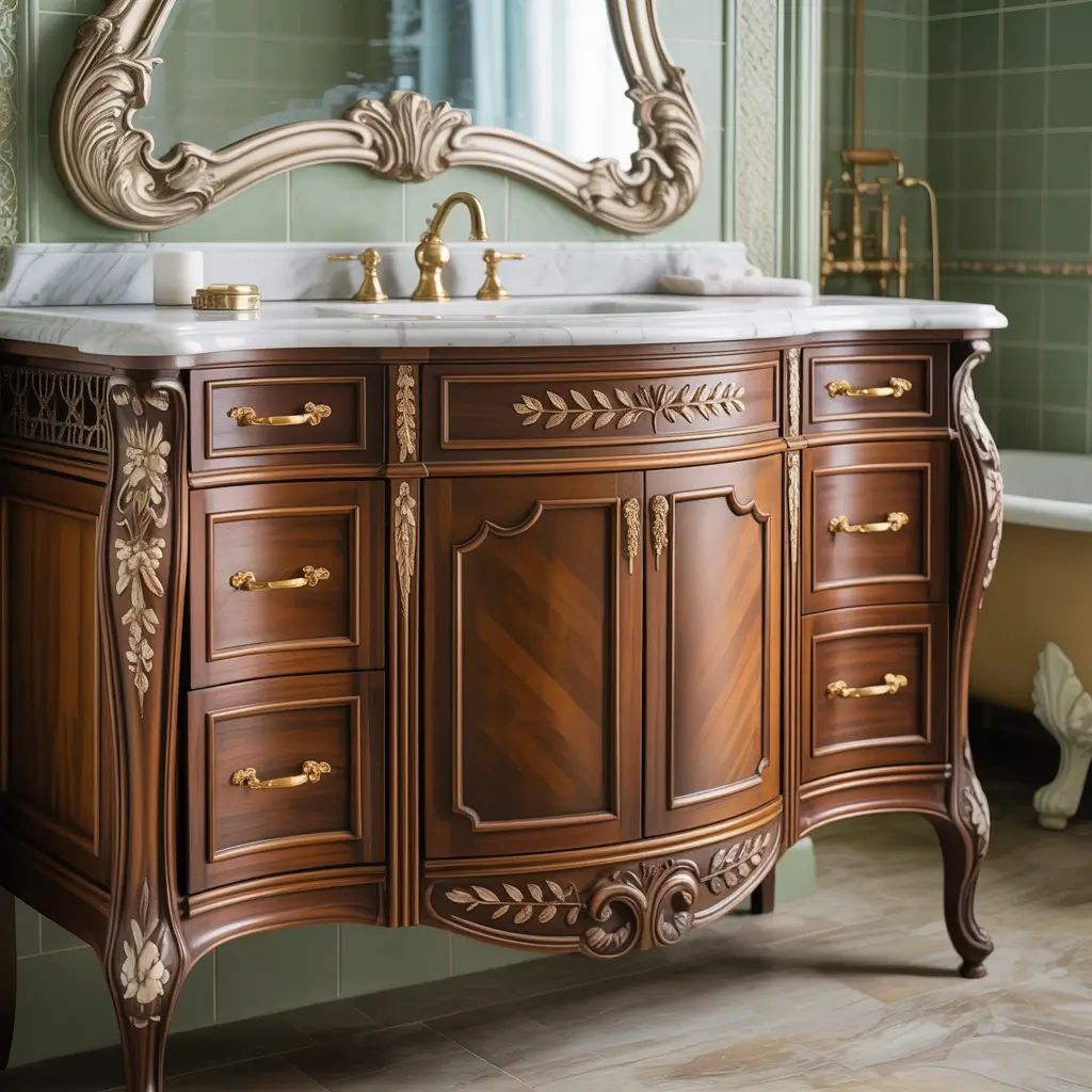 I replaced my boring rectangular vanity with a vintage-inspired piece featuring carved wooden flowers and curved cabinet doors. Every morning when I’m brushing my teeth, I feel like I’m getting ready in a Parisian apartment circa 1900. The best part? My contractor thought I was crazy until he saw the finished result—now he shows photos to all his clients.