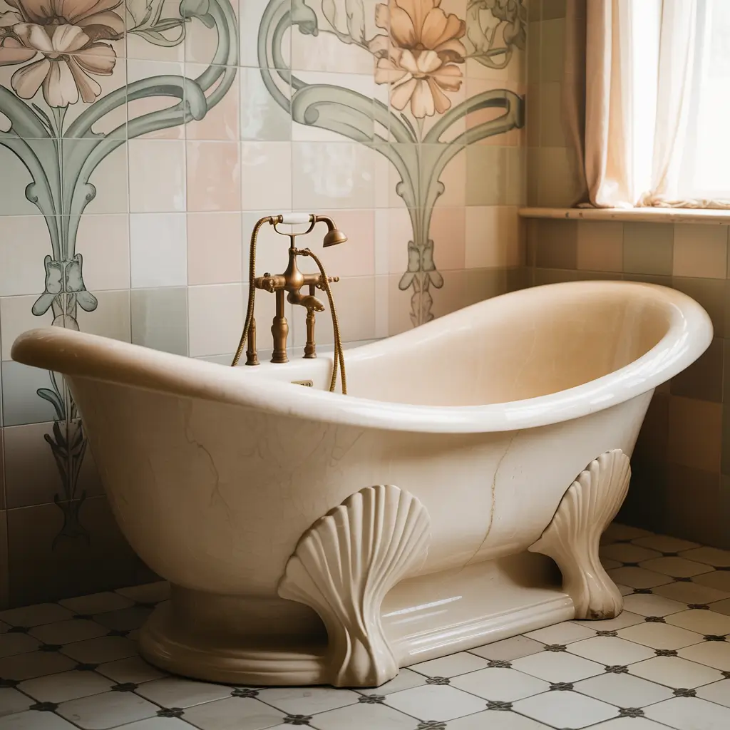 Art Nouveau tubs mimic natural pools and flower petals. They feature undulating edges, asymmetrical shapes, and often decorative feet that look like plant roots or animal paws.