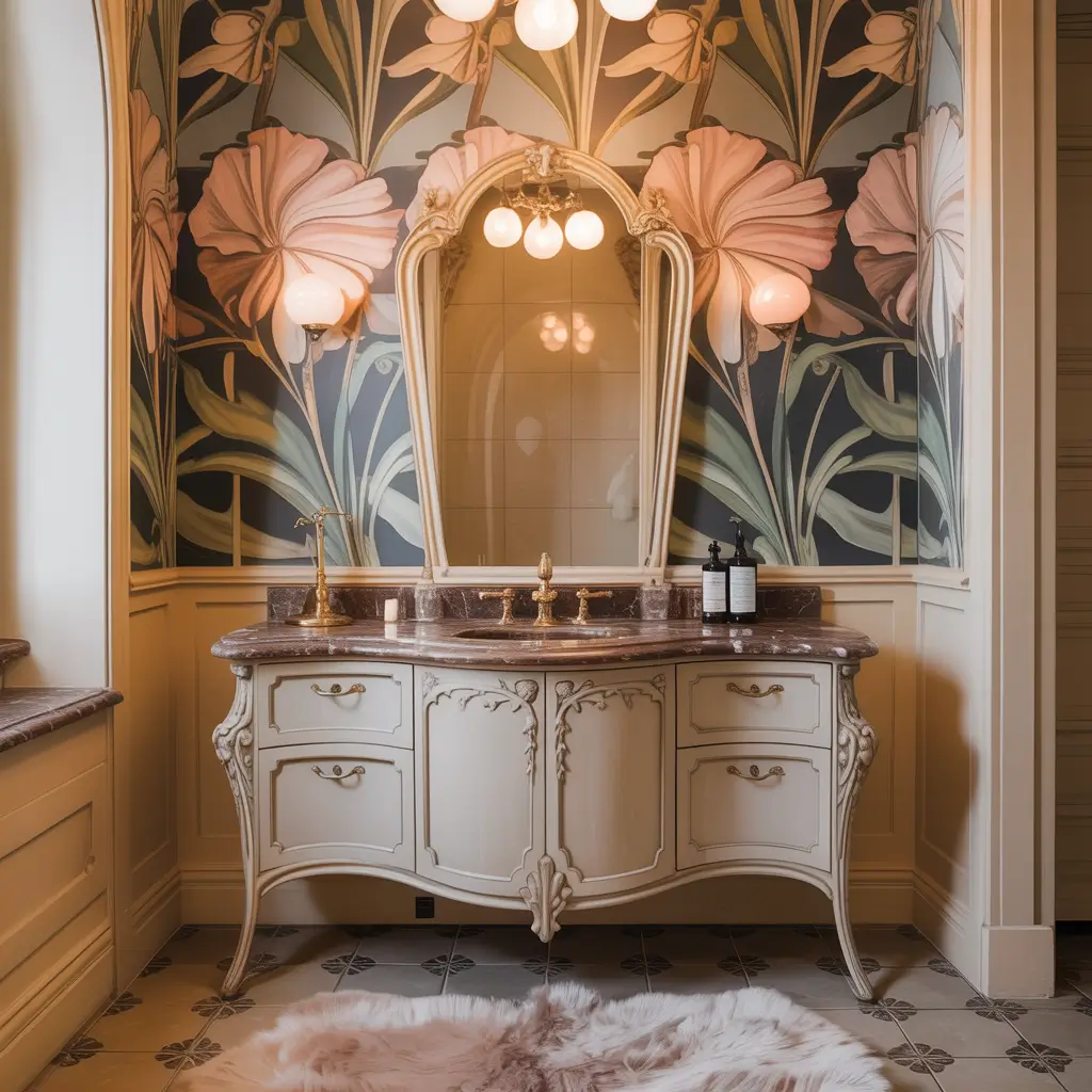 You don’t need to gut your entire bathroom to get this look. Even adding curved drawer pulls or applying decorative molding with floral patterns can transform a basic vanity. I’ve seen people use peel-and-stick designs to add temporary Art Nouveau flair—perfect for renters who want the look without the commitment.