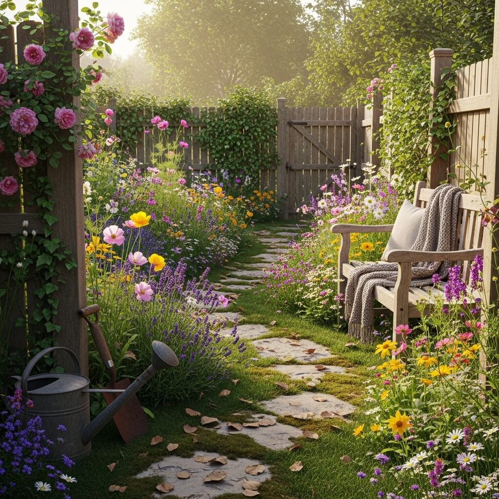 Start with a simple path—gravel, stepping stones, or brick. Add a focal point (a bench, birdbath, or small sculpture). Choose a few larger plants as anchors (roses, shrubs, or small trees). Then fill in with layers of flowering plants in varying heights. Let them grow together, overlap, and generally do their thing.