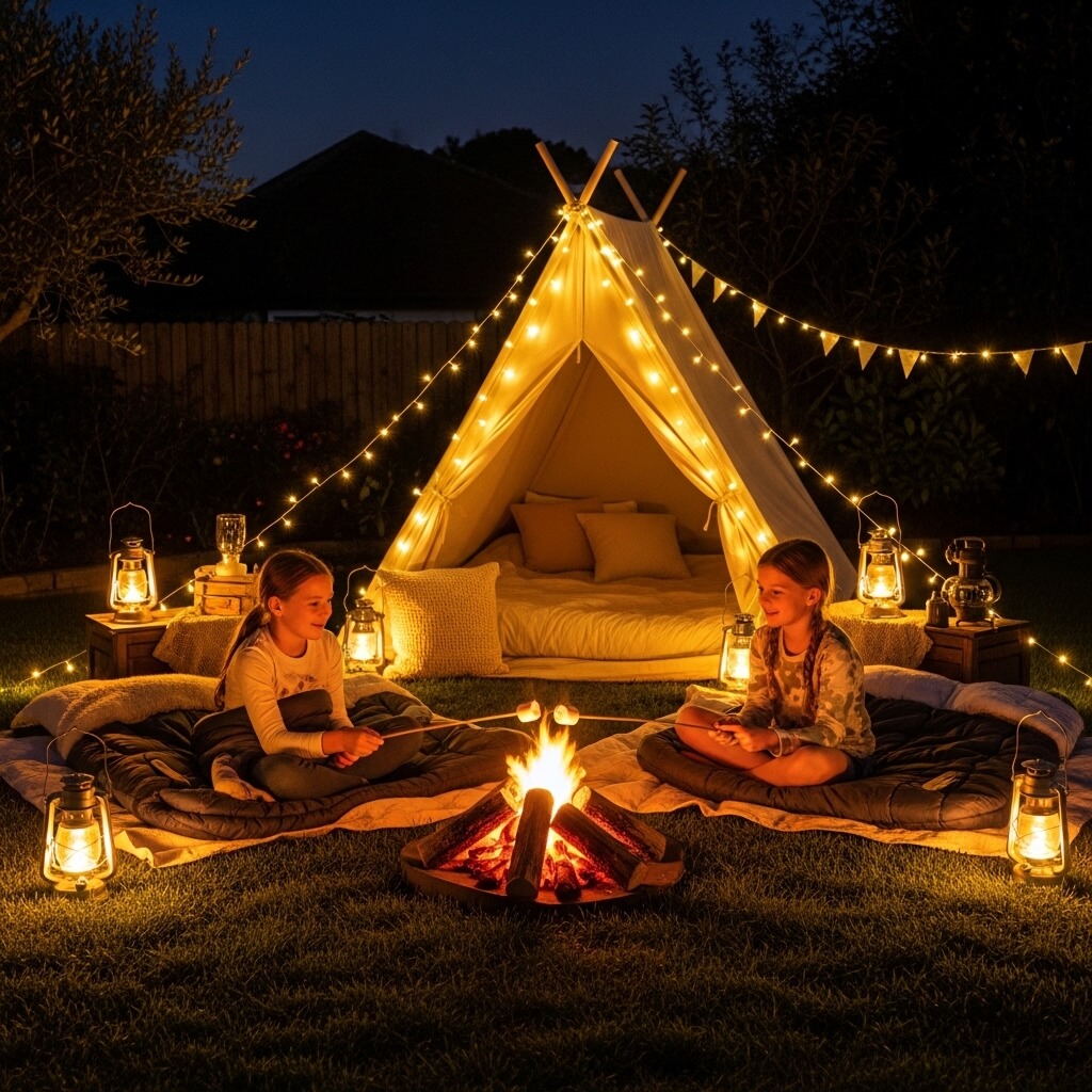 You don’t need much to make this happen. If you already have a tent, you’re halfway there. If not, you can build a fort using blankets, sheets, and chairs. Kids honestly don’t care—they just love the novelty of sleeping outside.