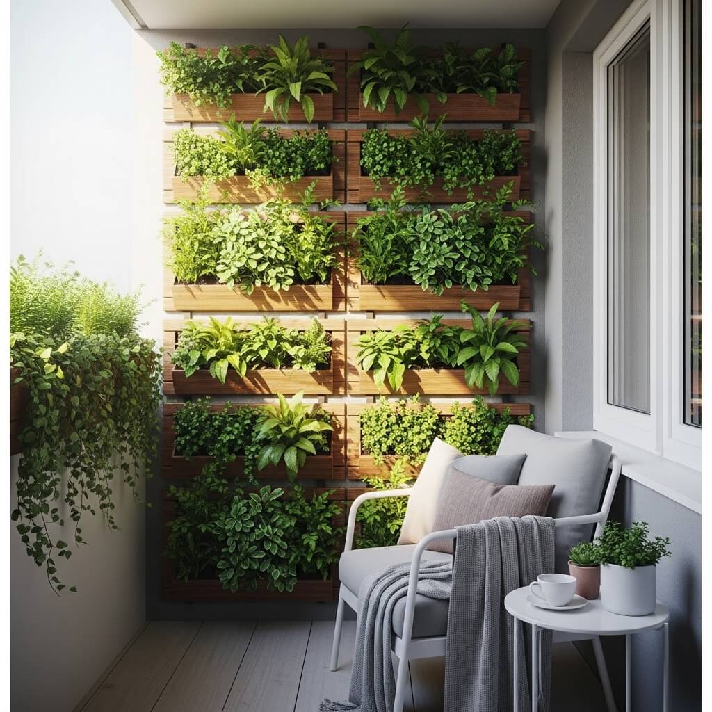 Vertical gardens are the ultimate balcony wall hack, and they’re way easier than you’d think. I’m talking about mounting planters directly on your wall to create a living, breathing piece of art. You can grab some affordable pocket planters from any home improvement store or even repurpose old containers you already have lying around.