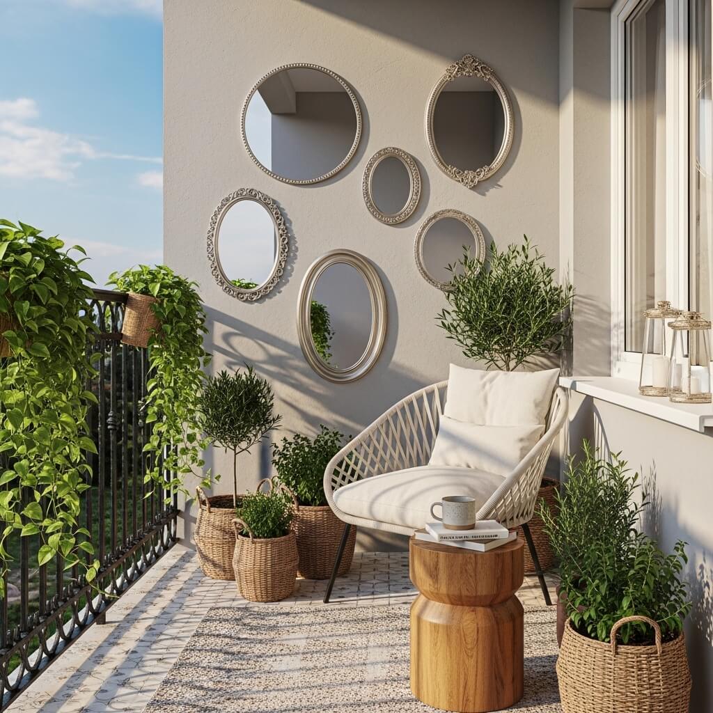 Adding mirrors to your balcony wall isn’t just about functionality (though checking your hair before that video call is nice). Strategic mirror placement can double the perceived size of your space and reflect natural light into shadier corners. Plus, they reflect your greenery and decor, creating this layered, dimensional effect that’s honestly kind of addictive to look at.