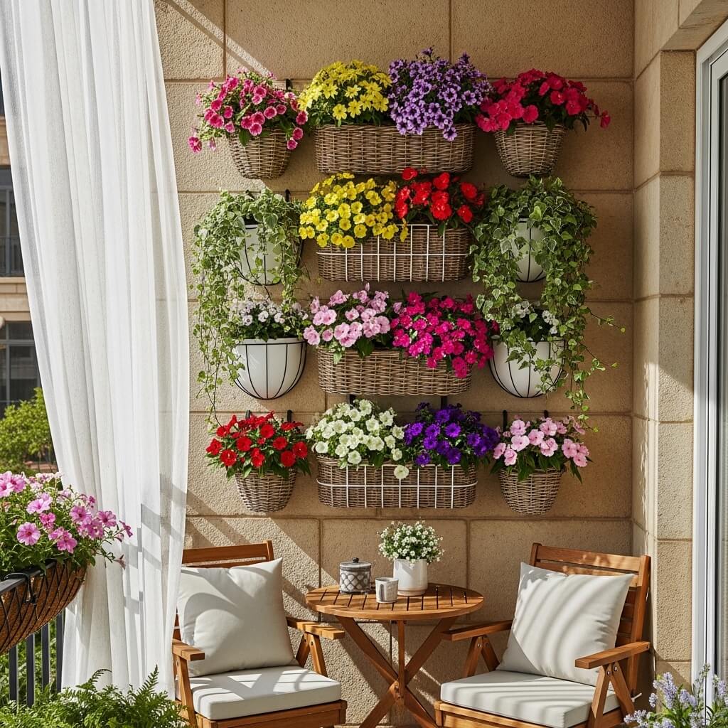 I’m talking about creating a green wall using multiple hanging baskets at different heights. The cascading effect of trailing plants against your wall creates this lush, layered look that seriously elevates your balcony game. Plus, hanging baskets are easy to switch out, water, and rearrange when you feel like changing things up.