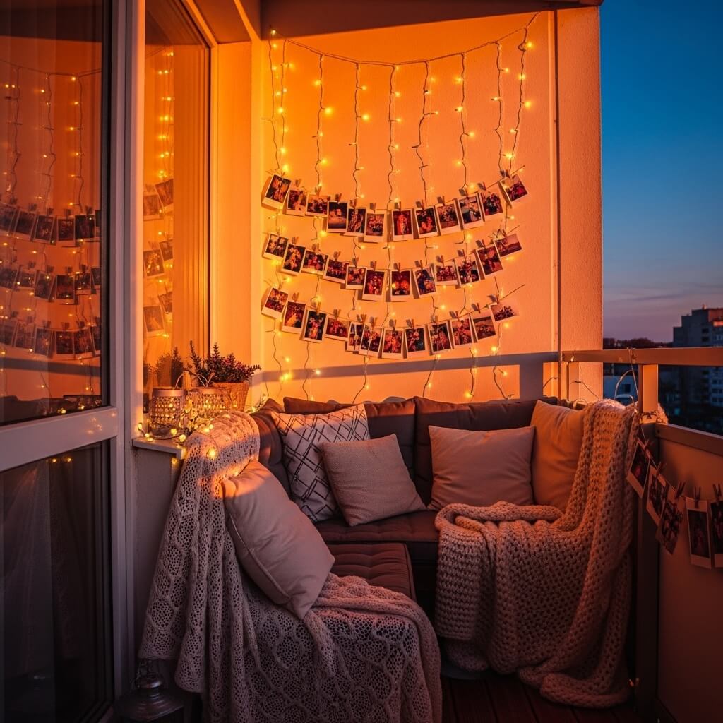 Here’s where this idea really shines (pun absolutely intended): evenings. During the day, it’s a cute photo display. But when the sun goes down and those lights come on? Your balcony transforms into this cozy, intimate space that makes you never want to go inside.