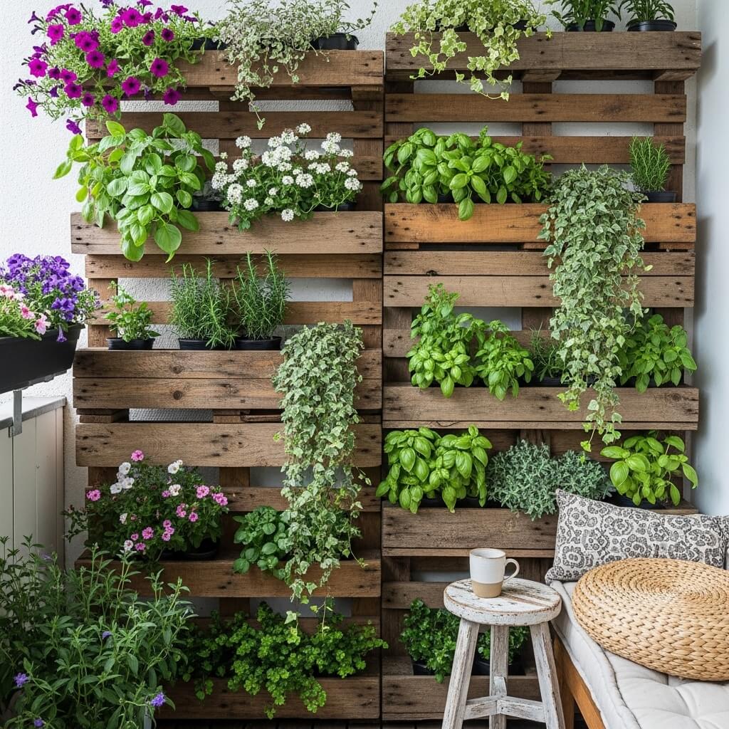 Okay, wooden pallets are like the Swiss Army knife of budget decor. You can do SO much with them, and for balcony walls, they’re absolute gold.