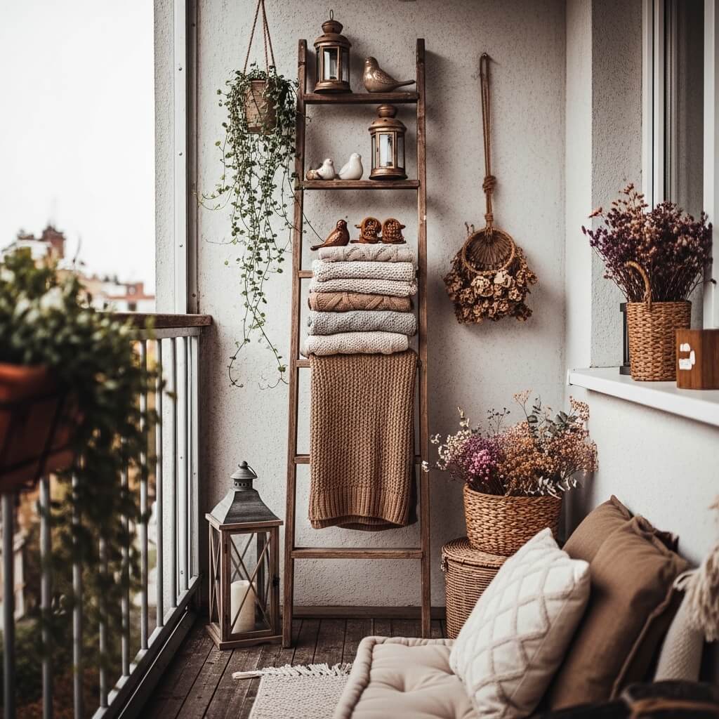 A rustic ladder mounted on your balcony wall creates an instant display system that’s both functional and decorative. You can hang plants from the rungs, drape string lights over it, clip photos to it, hang small baskets—the versatility is unreal.