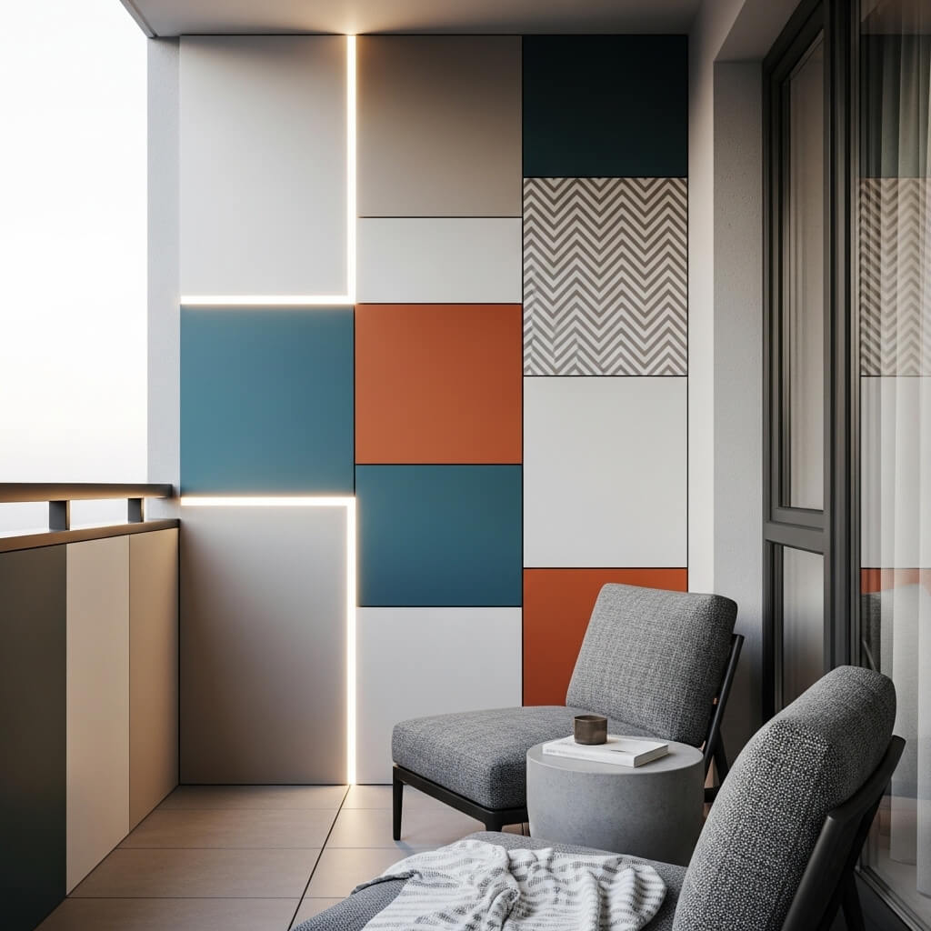 Paint or stain your panels to match your balcony’s color scheme. I went with a weathered gray stain that complements my other wood elements but contrasts nicely with the white wall behind it. You could also go bold with a pop of color—a deep blue or emerald green geometric panel against a neutral wall would be stunning.