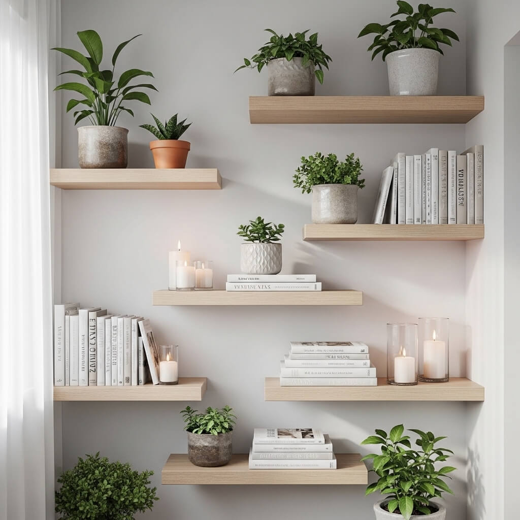 I installed three simple white floating shelves in a staggered arrangement on one wall of my balcony. The cost? About $30 for all three shelves. Then I styled them with a mix of small potted succulents, a couple of white candles, and one small decorative object per shelf. The rule I follow: less is more.