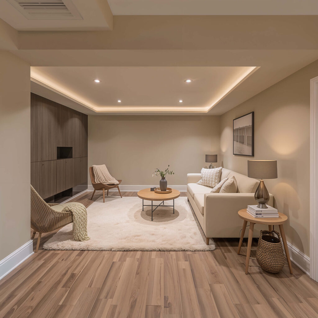 Let’s kick things off with something that won’t give your mother-in-law a heart attack when she visits. Neutral colors create that perfect foundation where you can’t really go wrong. Think warm beiges, soft taupes, and creamy whites that make your basement feel less like a cave and more like an extension of your home.