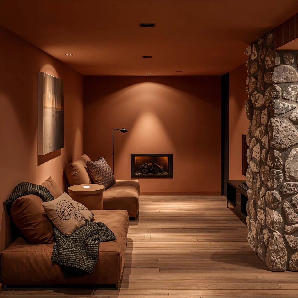 Earth tones bring that organic, grounded feeling to your basement. We’re talking terracotta, ochre, sienna, and all those colors that sound like expensive coffee drinks. These shades create instant warmth and make your basement feel like a natural extension of the outdoors.