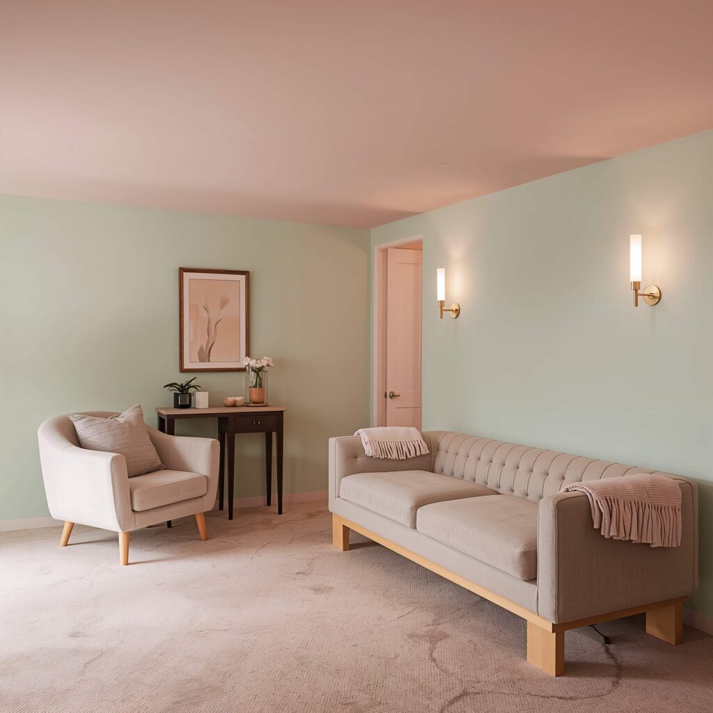 Think dusty rose, sage green, soft lavender, and buttery yellow. These colors reflect light beautifully, making your basement feel airy despite the lack of windows. My best friend’s basement game room rocks mint green walls with blush pink accents. Sounds weird? It’s actually stunning.