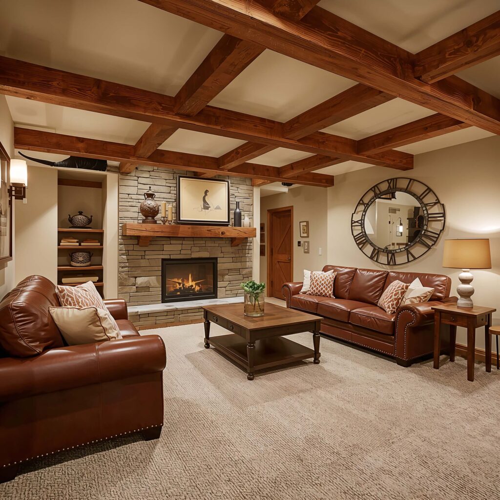 Nothing beats the warmth of wood paired with soft neutrals. This combination creates instant coziness that makes basements feel like luxury lodges. Plus, wood elements hide dings and scratches like nobody’s business.