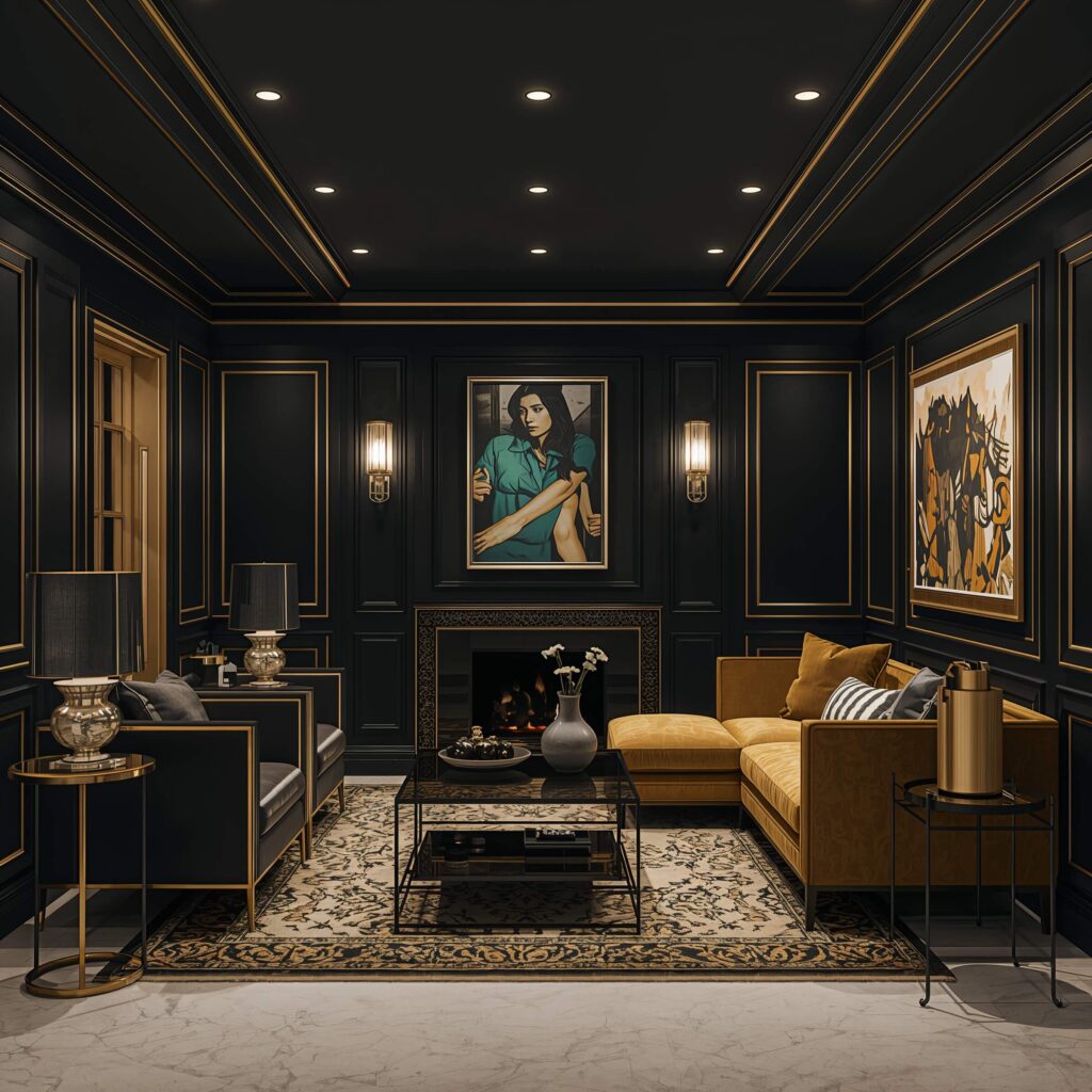 Start with black as your base – maybe one accent wall or dark furniture. Then sprinkle gold accents throughout: picture frames, light fixtures, hardware. The key is restraint. Gold should whisper luxury, not scream it.