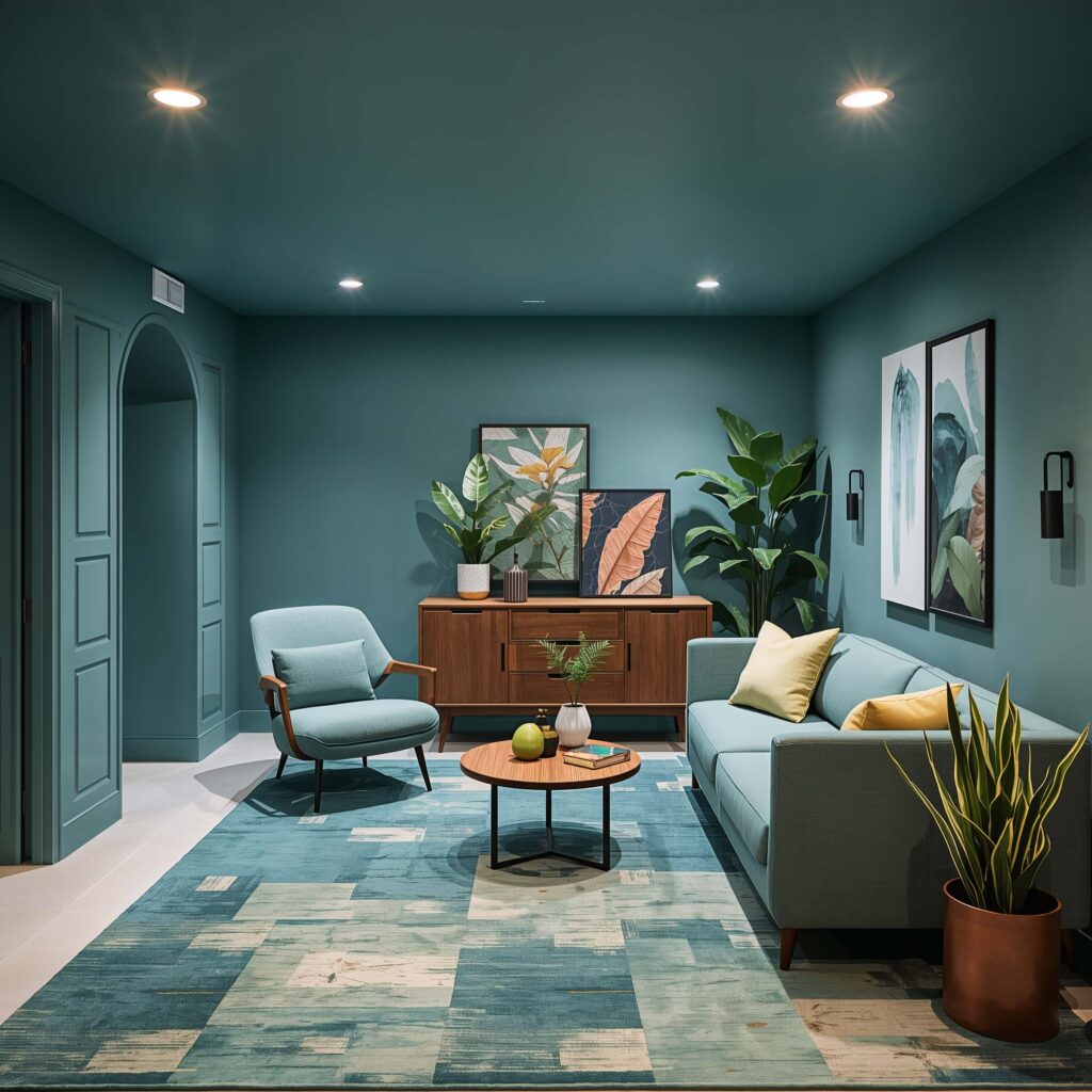 Blue and green together? Absolutely. These cool colors create calm, refreshing spaces perfect for basements that double as home offices or relaxation zones. Think ocean meets forest, not Seahawks fan cave.