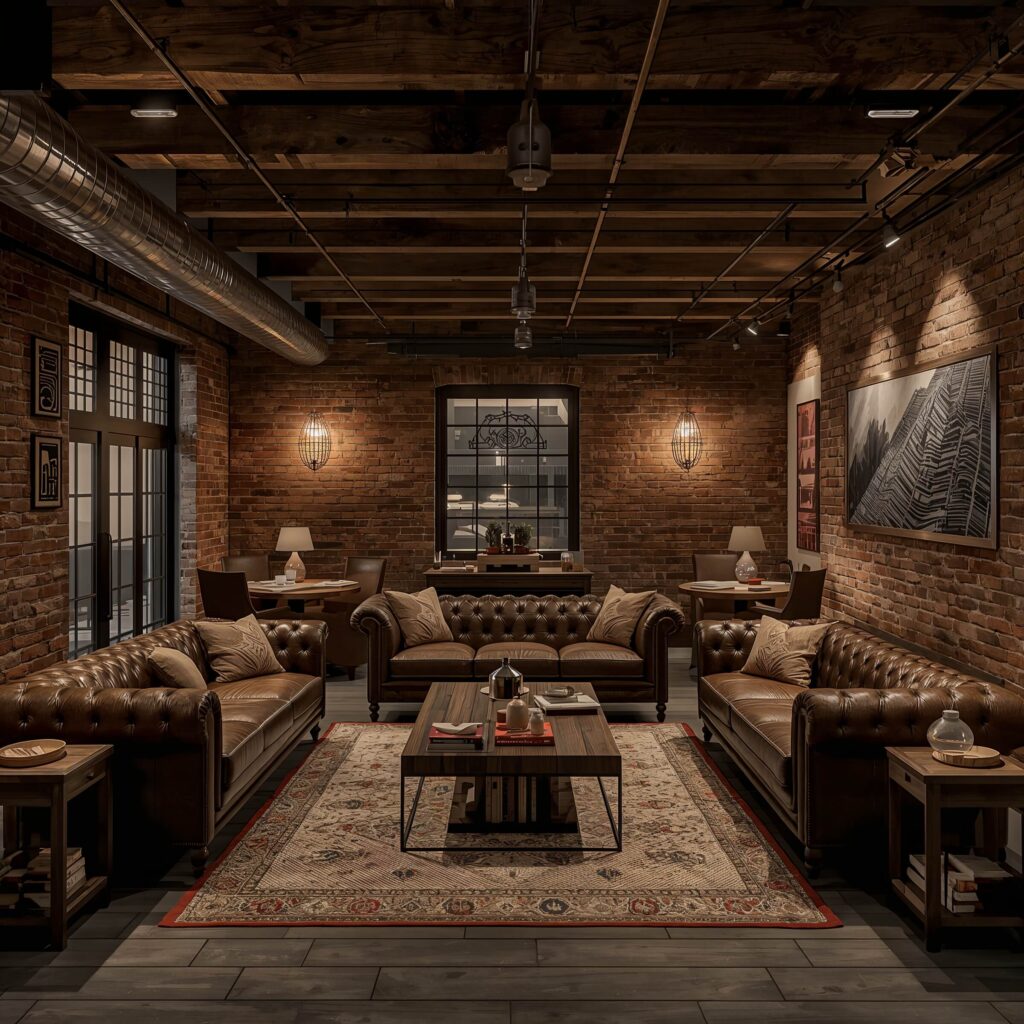 Just because we’re going industrial doesn’t mean we’re sacrificing comfort. Leather furniture works incredibly well here. I found a worn leather couch at an estate sale that looked like it belonged in a prohibition-era speakeasy. Paired with some plaid throw pillows and a vintage area rug, the space feels both masculine and inviting.