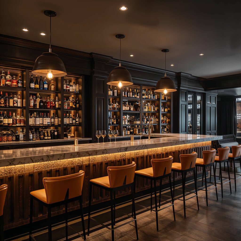 Lighting sets the mood entirely. Install pendant lights over the bar top, add LED strips under the bar edge, and throw in some dimmable sconces on the walls. The layered lighting approach creates ambiance while keeping things functional when you’re mixing drinks.