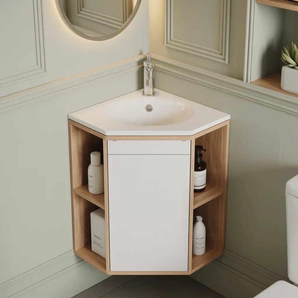 Corner basin units are the answer to that awkward corner space that every small bathroom seems to have. I installed one in my powder room, and that previously useless corner now holds a surprising amount of stuff while taking up minimal floor space.