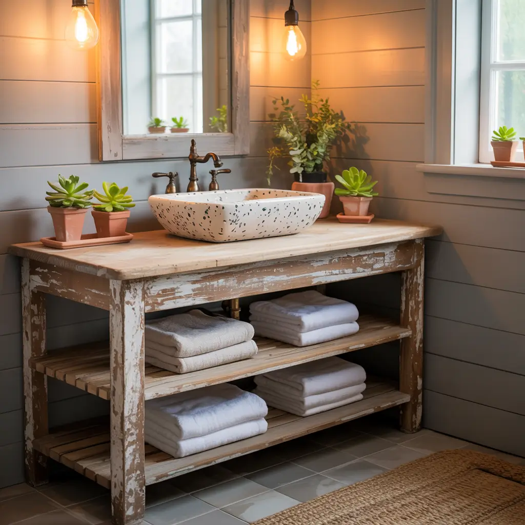 The key to rustic vanities is making them look deliberate, not like you found something on the curb and called it a day. I paired mine with modern elements—a sleek vessel sink, contemporary faucet, and minimalist mirror. The contrast keeps it from feeling like I’m living in a cabin.