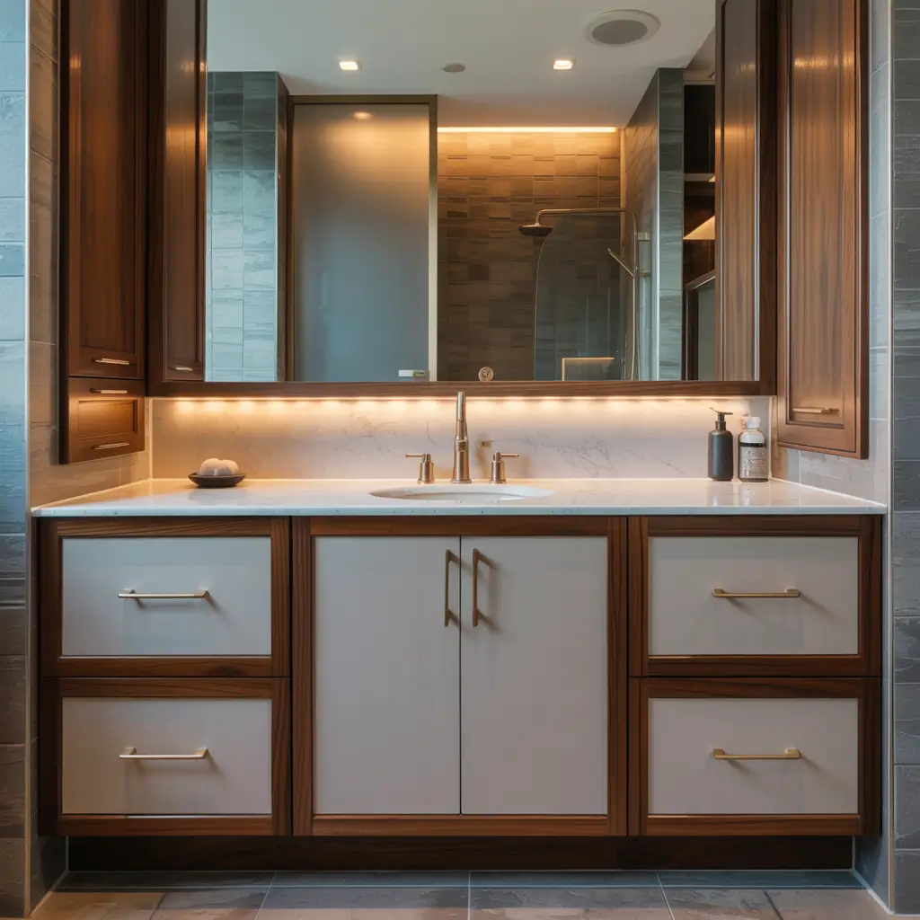 Modern cabinets embrace clean lines and hidden functionality. Mine has integrated handles that are just subtle grooves in the door fronts. No protruding hardware to catch towels on or collect grime. The interior includes USB charging ports (game-changer for electric toothbrushes) and LED strips that turn on when you open the doors.