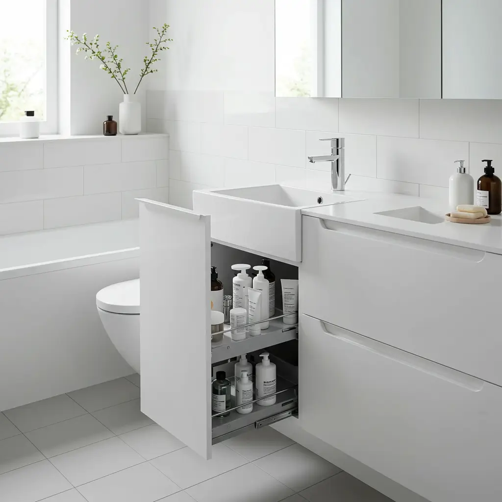 Traditional basin cabinets waste the back half of their depth. You stack things in front of other things, and eventually, products migrate to the back to die. Pull-out shelves solve this by bringing everything to you.