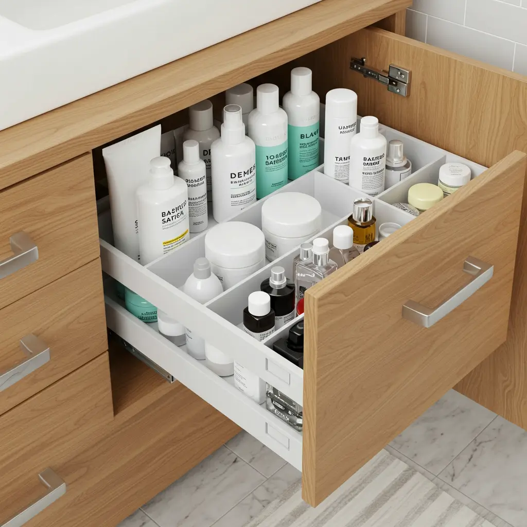 I use shallow containers inside the drawers to prevent the dreaded product migration—you know, when everything slides to the back corner like it’s trying to escape.