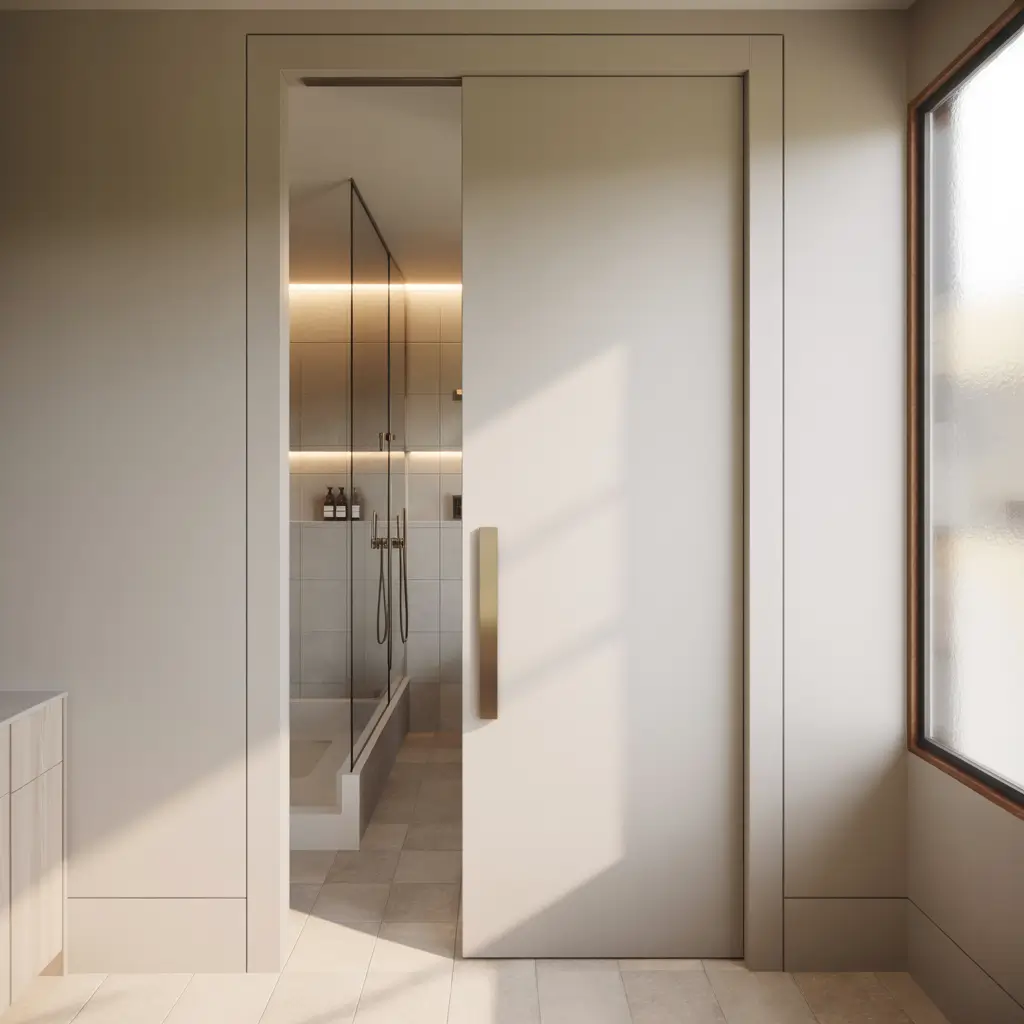 When open, pocket doors slide completely into a wall cavity, freeing up the floor space that swinging doors consume. In tiny bathrooms where every inch counts, this can mean the difference between cramped and comfortable.