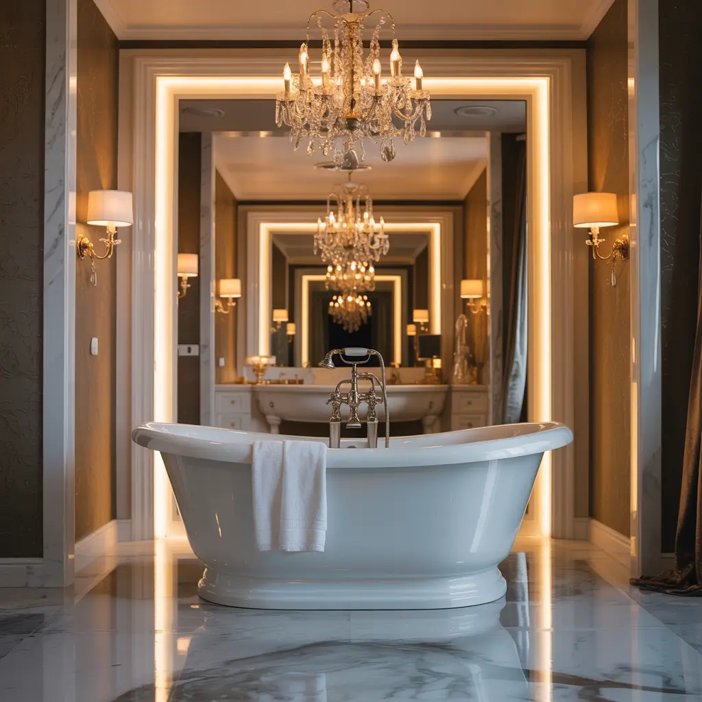 Luxury bathroom lighting layers different sources for different purposes. Task lighting for applying makeup, ambient lighting for soaking in the tub, and accent lighting to highlight your gorgeous tile work. It’s basically theater production for your bathroom.