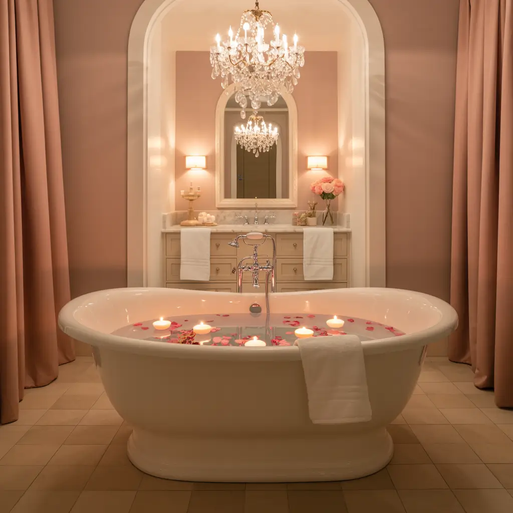 Creating a romantic bathroom doesn’t mean covering everything in red roses and heart-shaped tubs (please don’t). Modern romantic luxury uses soft textures, warm lighting, and intimate details to create spaces perfect for unwinding together.