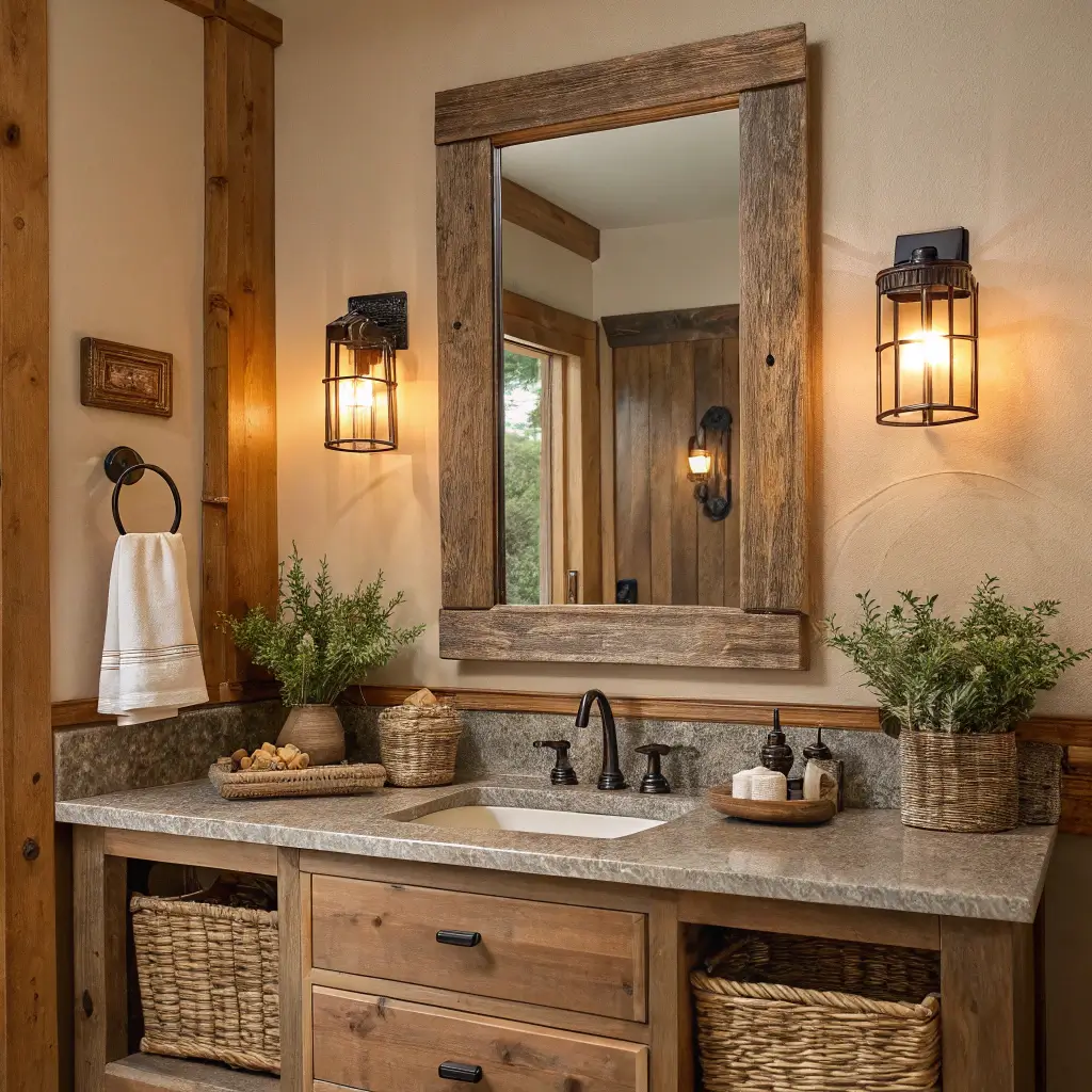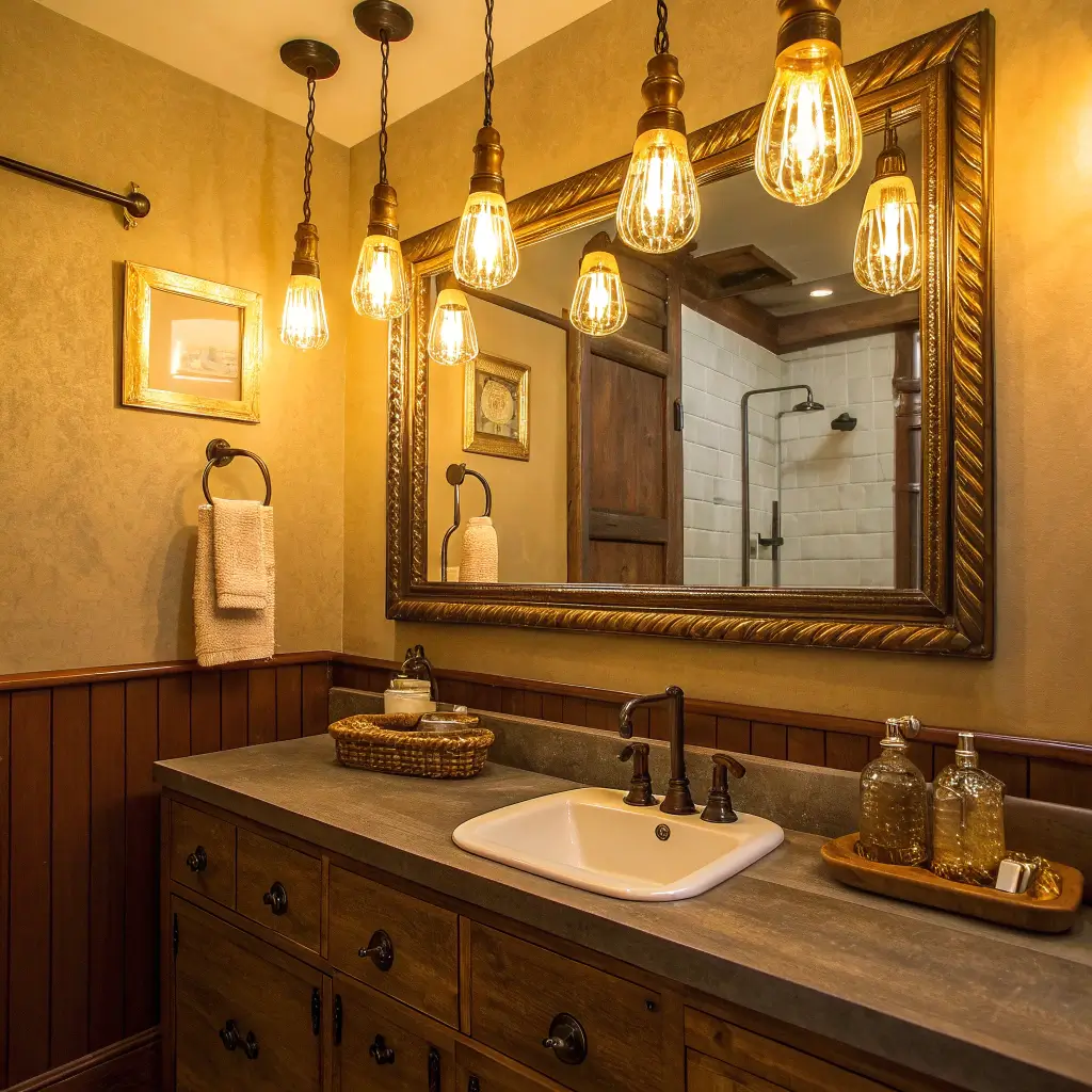 Pair wooden sconces with Edison-style bulbs for maximum rustic appeal. The warm amber glow complements wood tones beautifully while providing flattering light that makes everyone look well-rested. Install two sconces above a wide mirror or one centered above a smaller mirror.