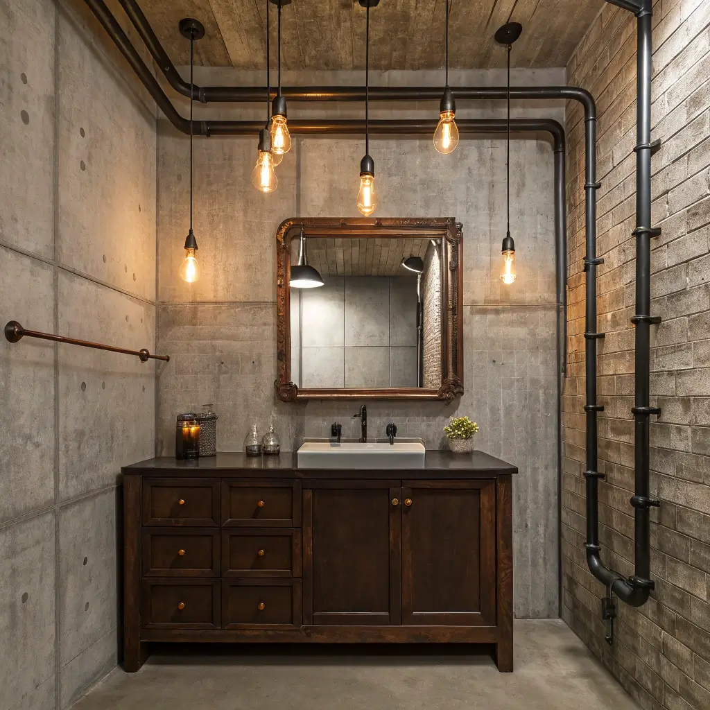 Industrial style brings urban edge to any bathroom. Black iron pipe fixtures mounted above your mirror create that exposed, warehouse-chic vibe that makes everything feel cooler and more intentional.