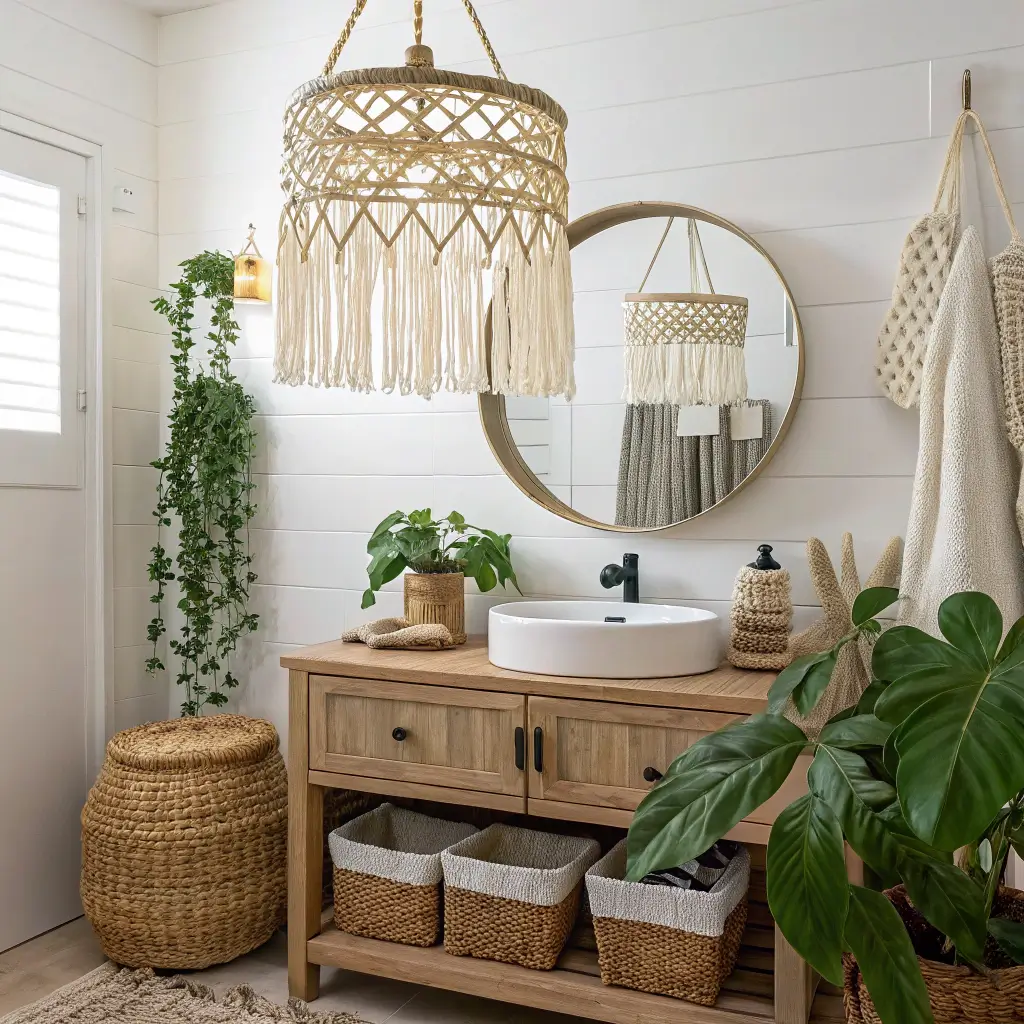 Macramé pendants work best over smaller mirrors in powder rooms or guest bathrooms. The woven texture adds visual interest and softness that contrasts beautifully with hard bathroom surfaces. Just make sure your pendant can handle occasional humidity—natural fibers like cotton or jute work better than synthetic materials that might get weird when damp.