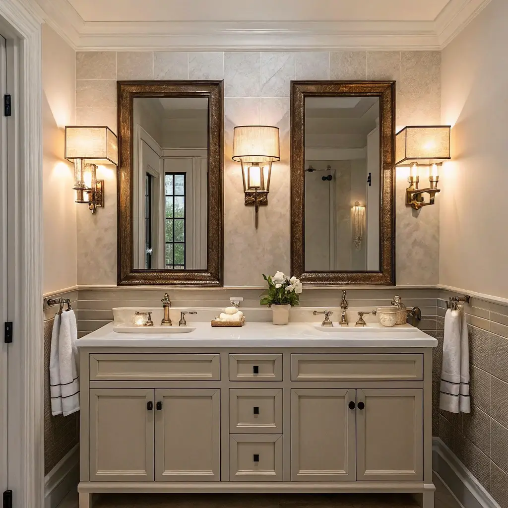 Sometimes the classic approach is classic for a reason. Two matching sconces flanking or positioned above your mirror create perfectly balanced lighting that’s both functional and timeless.
