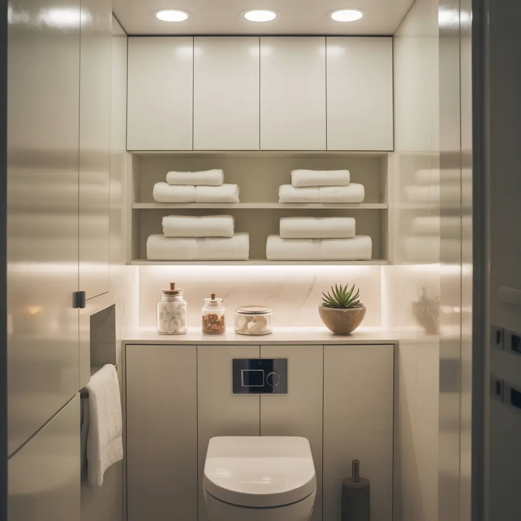 If you’re renovating or just really committed to the cause, built-in cabinets above the toilet create the cleanest, most sophisticated look possible. Everything hides behind doors, making your bathroom look perpetually organized even when it’s absolutely not.