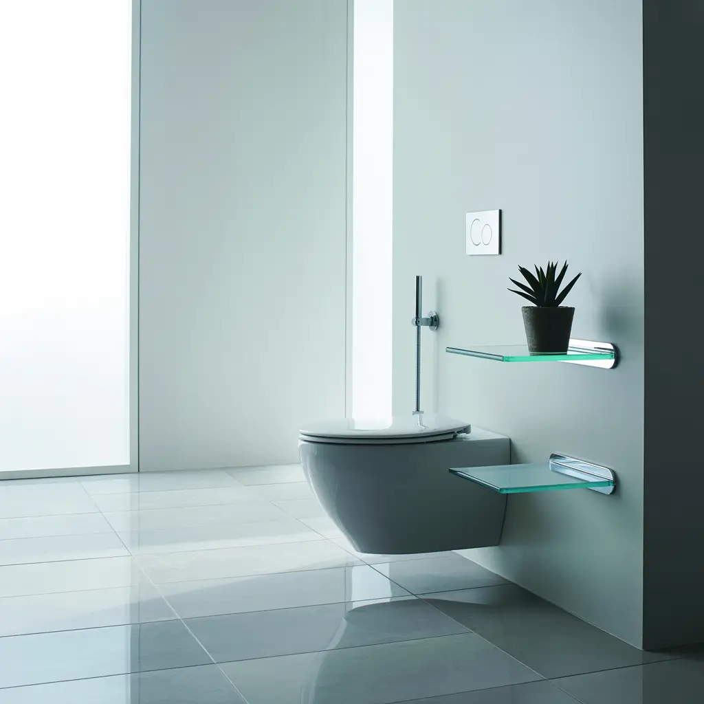 Nothing says modern and sophisticated quite like tempered glass shelves floating above your toilet. They’re practically invisible, which keeps your bathroom feeling open and uncluttered while still providing storage.
