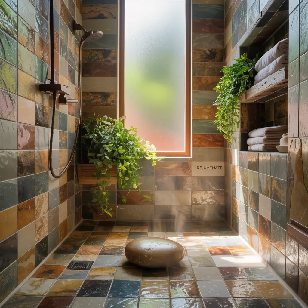The key to nailing the natural look? Mix different stone textures and sizes. Use larger tiles on walls with pebble mosaic floors. Add a stone bench. Incorporate wood-look tiles as accents.