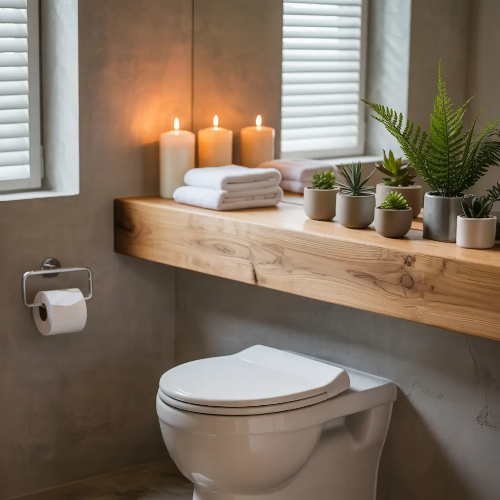 Floating shelves above the toilet transform dead space into prime real estate. This vertical storage solution makes use of an area most people completely ignore.