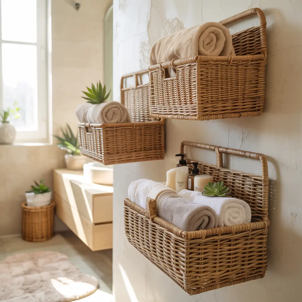 Wall-mounted baskets add storage with style. These versatile containers work anywhere you have wall space and come in materials to match any bathroom aesthetic.