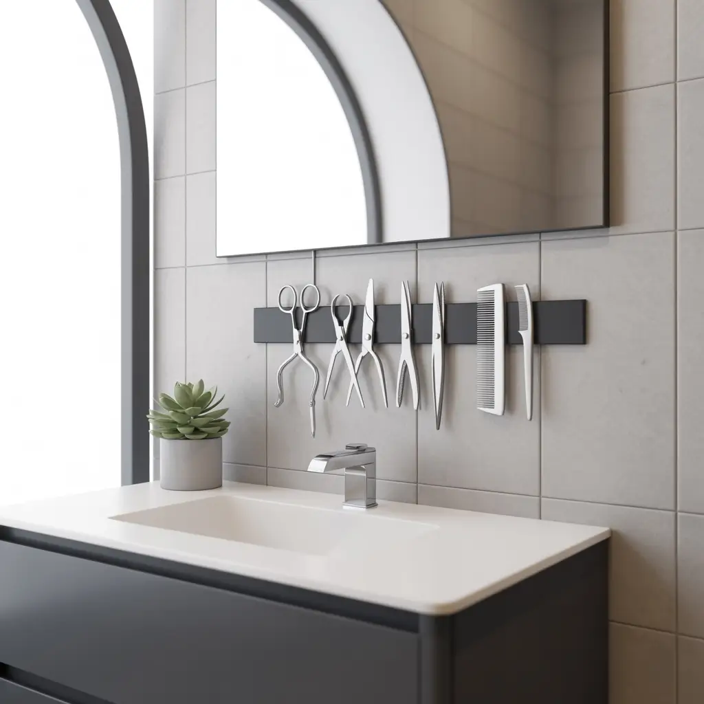 Magnetic strips keep metal items organized and visible. This simple solution prevents drawer digging for tweezers, nail clippers, and bobby pins.