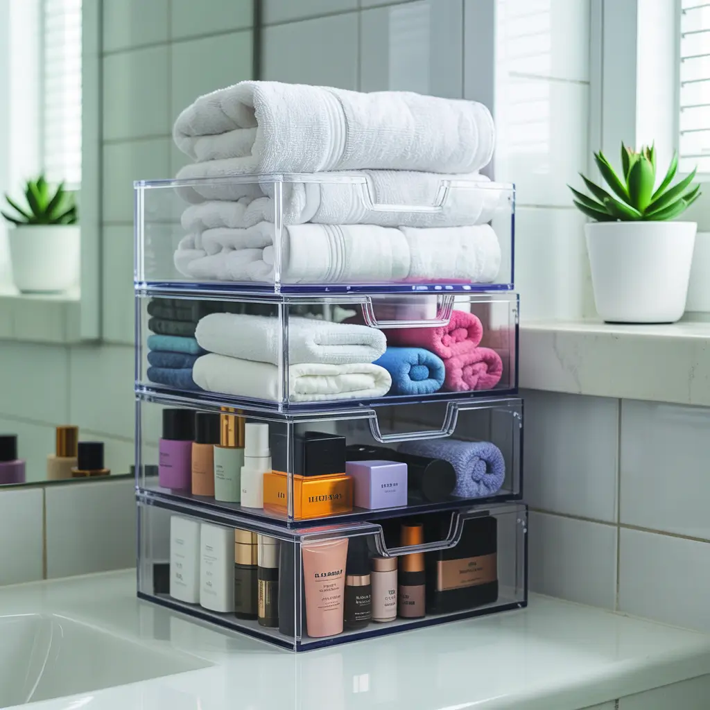 Clear stackable bins create customizable storage that grows with your needs. These versatile containers let you see contents while maximizing vertical space.